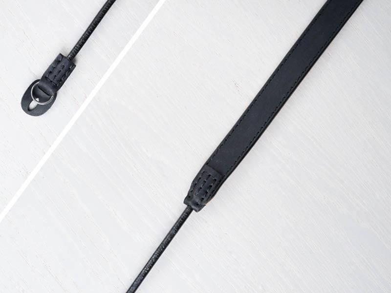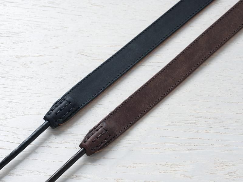 ストラップの装着にリングを使用するタイプの一眼レフやミラーレスカメラ・レンジファインダーなどに最適な、太めの革紐を使ったストラップです。