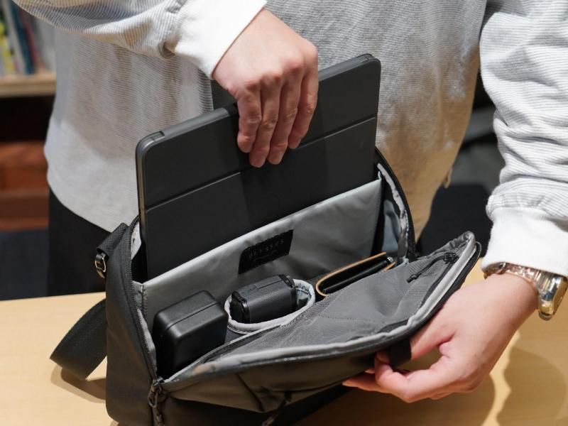 そんな時に、一般的な「iPadが入るガジェットバッグ」の場合、天面があるので引っ掛かってしまい、iPadを真上に引き抜けません。